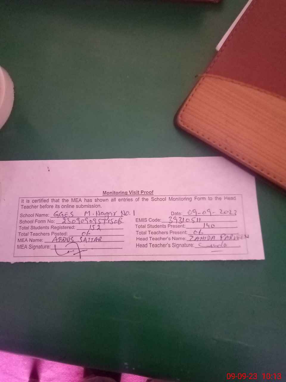 | Attendance Register | Head Teacher | MEA with School | Visit Proof |