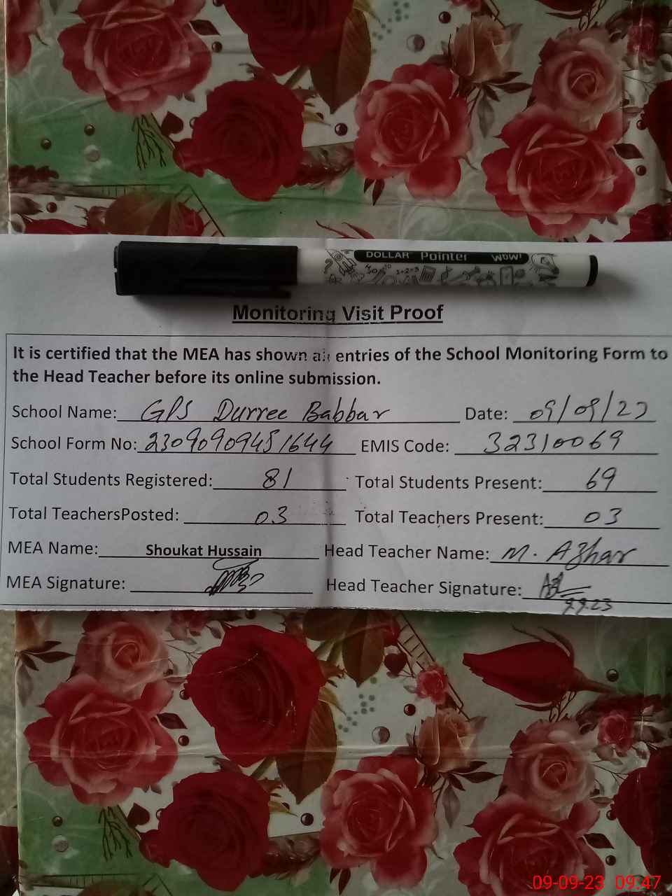 | Attendance Register | Head Teacher | MEA with School | Visit Proof |