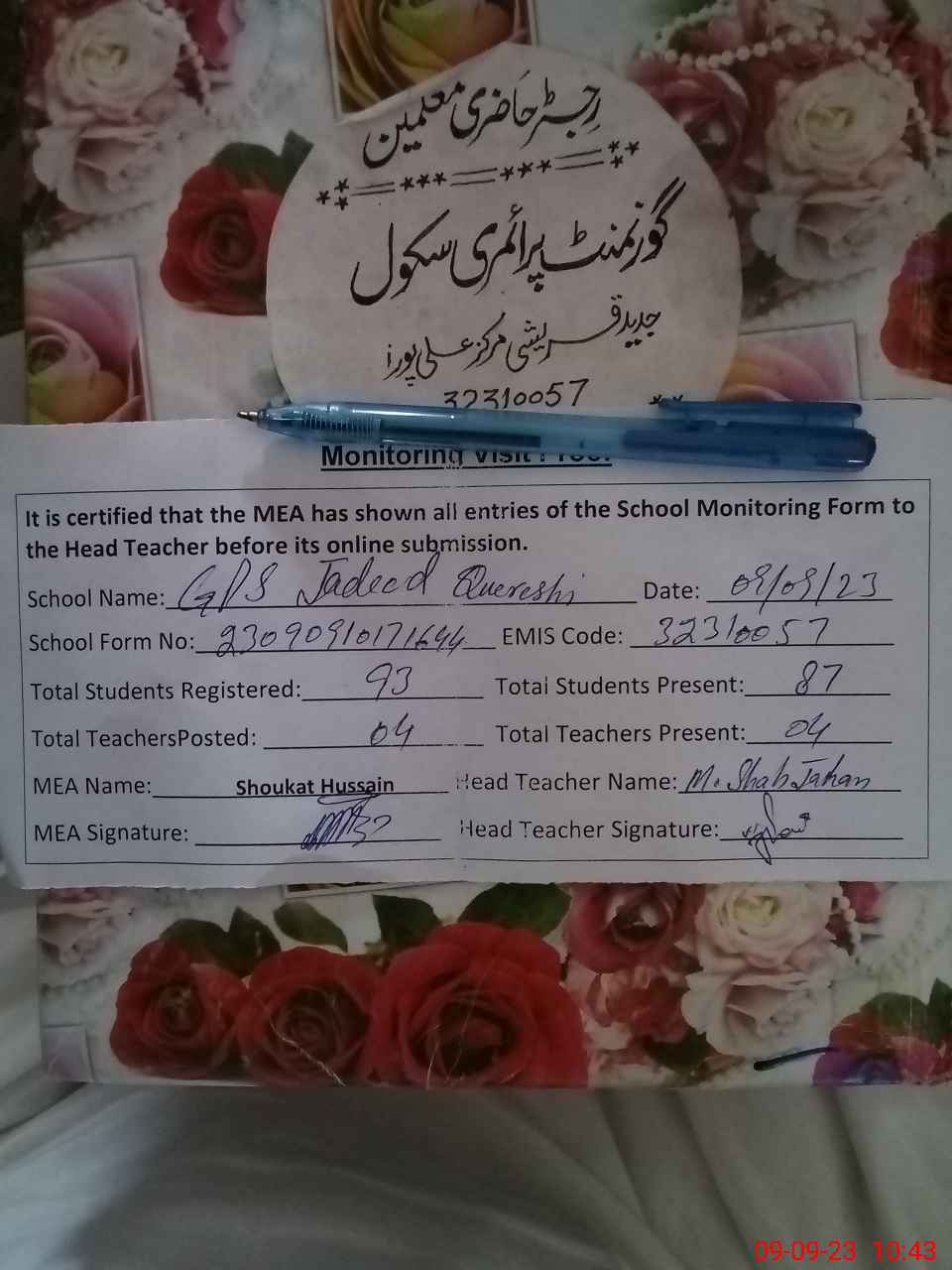 | Attendance Register | Head Teacher | MEA with School | Visit Proof |