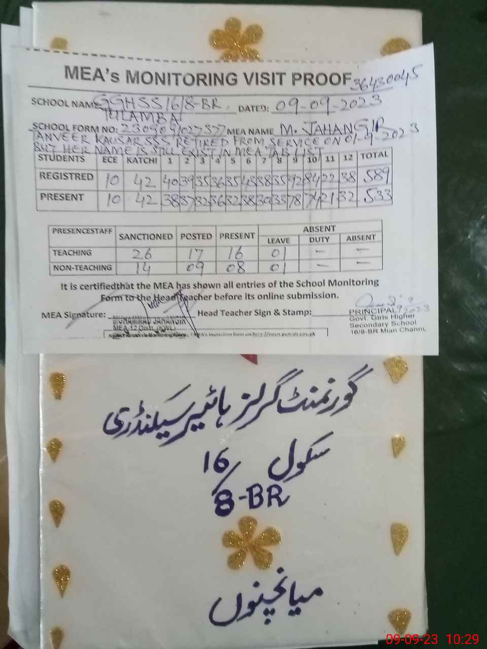 | Attendance Register | Head Teacher | MEA with School | Visit Proof |