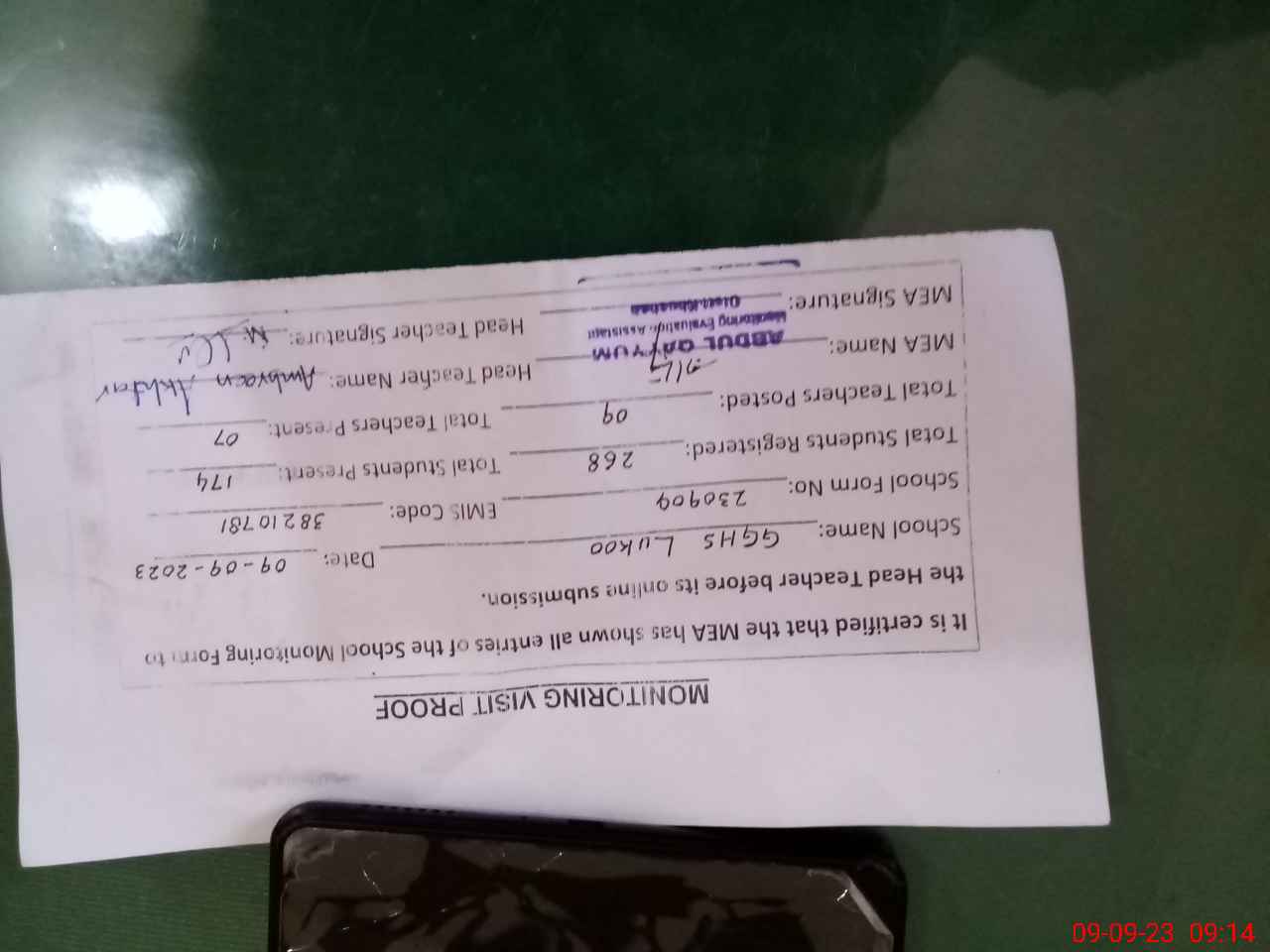 | Attendance Register | Head Teacher | MEA with School | Visit Proof |
