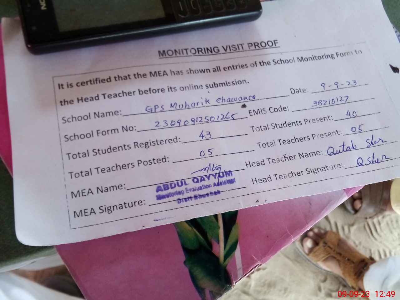 | Attendance Register | Head Teacher | MEA with School | Visit Proof |