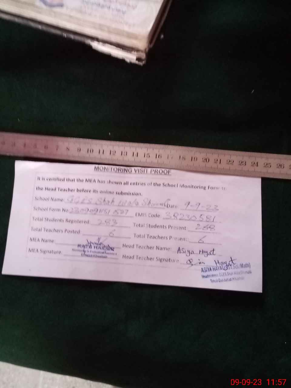 | Attendance Register | Head Teacher | MEA with School | Visit Proof |