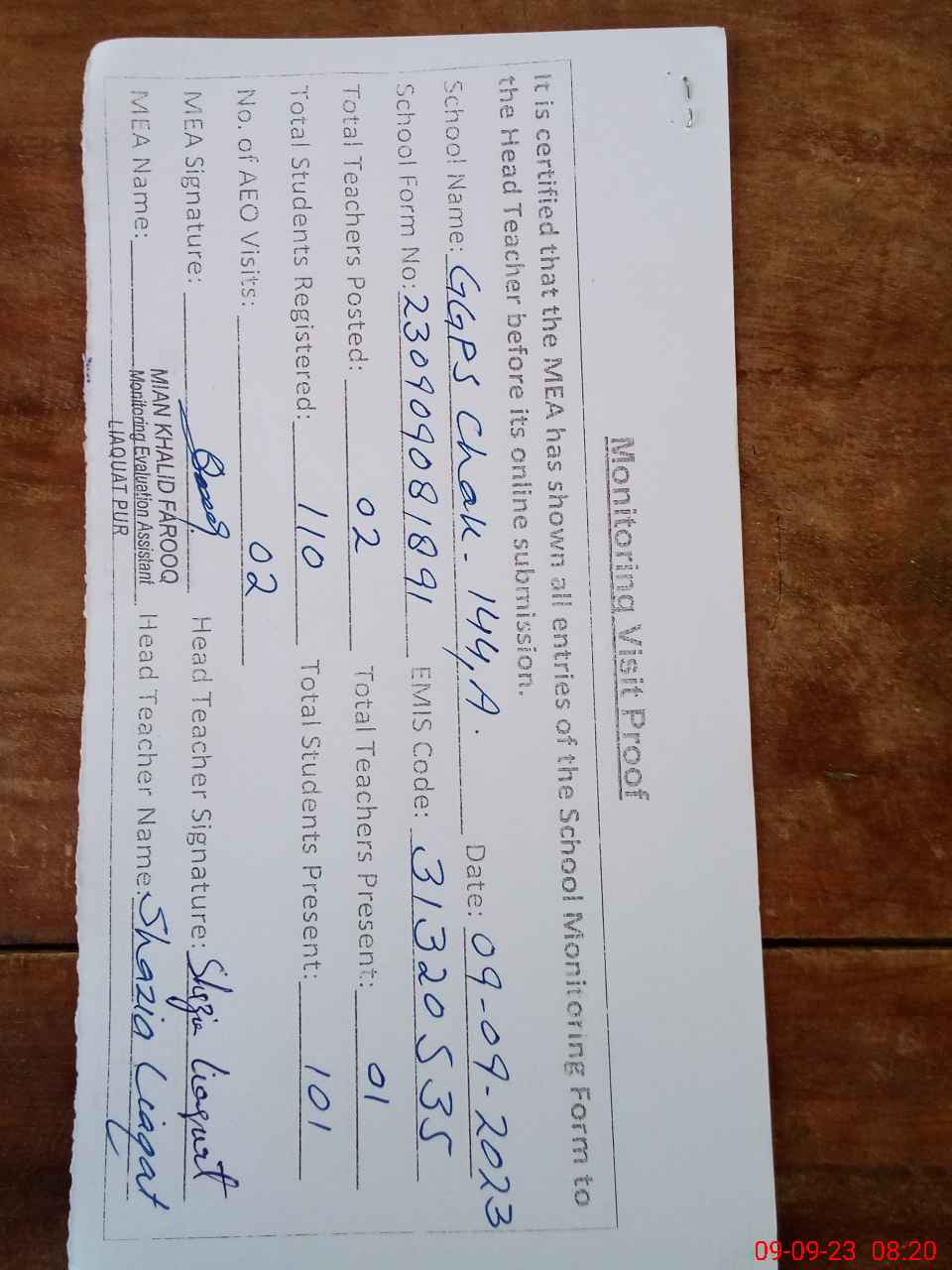 | Attendance Register | Head Teacher | MEA with School | Visit Proof |