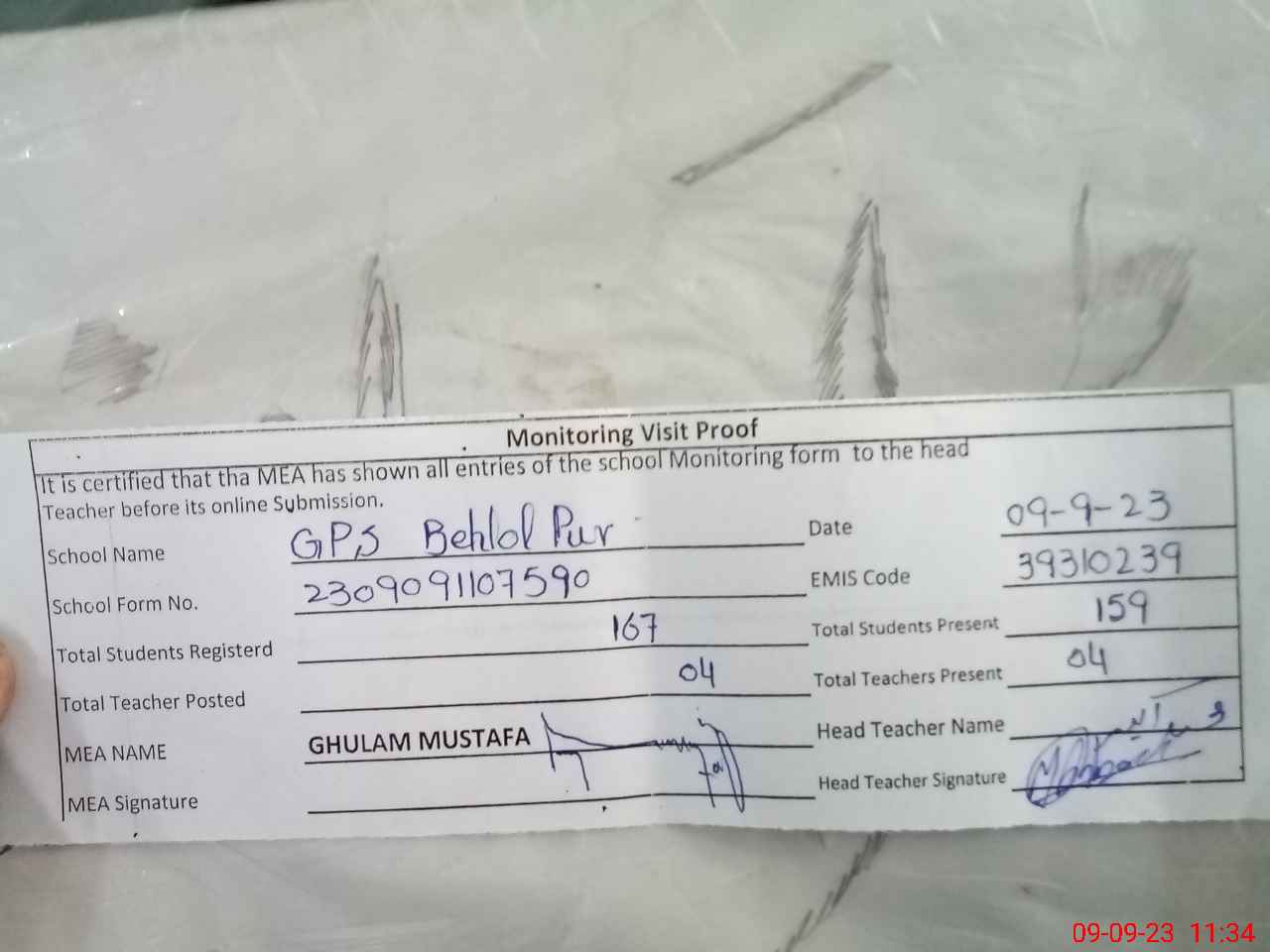 | Attendance Register | Head Teacher | MEA with School | Visit Proof |