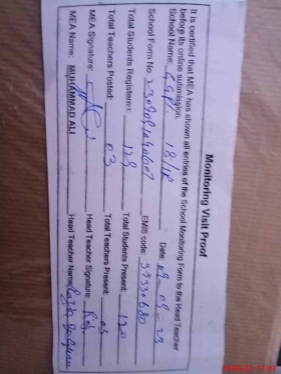 | Attendance Register | Head Teacher | MEA with School | Visit Proof |