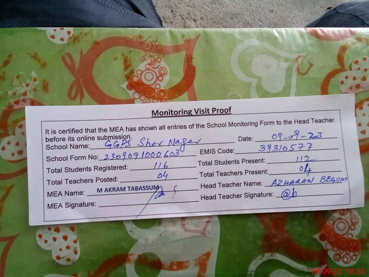 | Attendance Register | Head Teacher | MEA with School | Visit Proof |