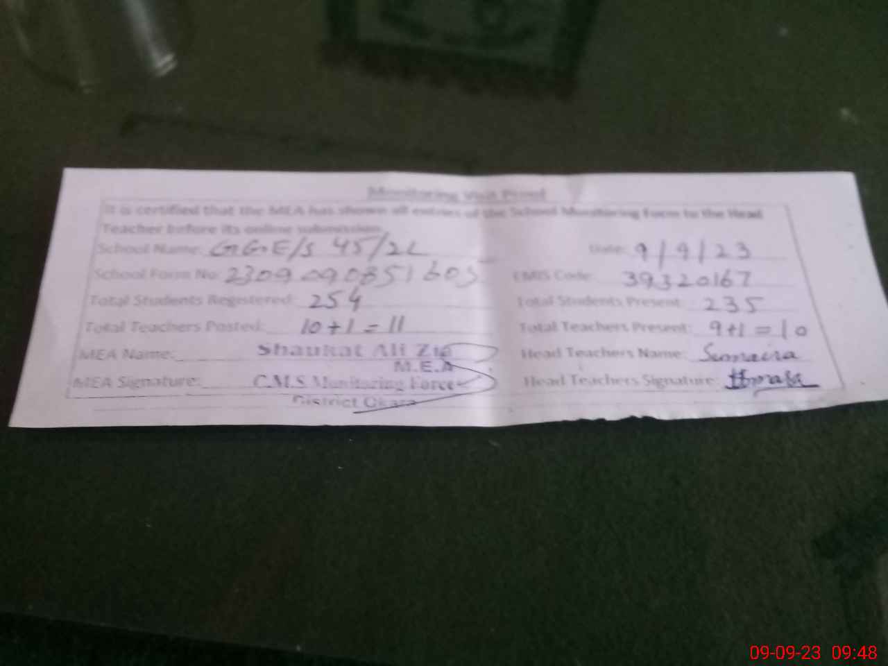 | Monitoring Date: 09-09-2023 | Start Time: 09-09-2023 08:51 AM | End Time: 09-09-2023 09:52 AM | Name of MEA: SH**** AL**** ZI**** (R**** | |