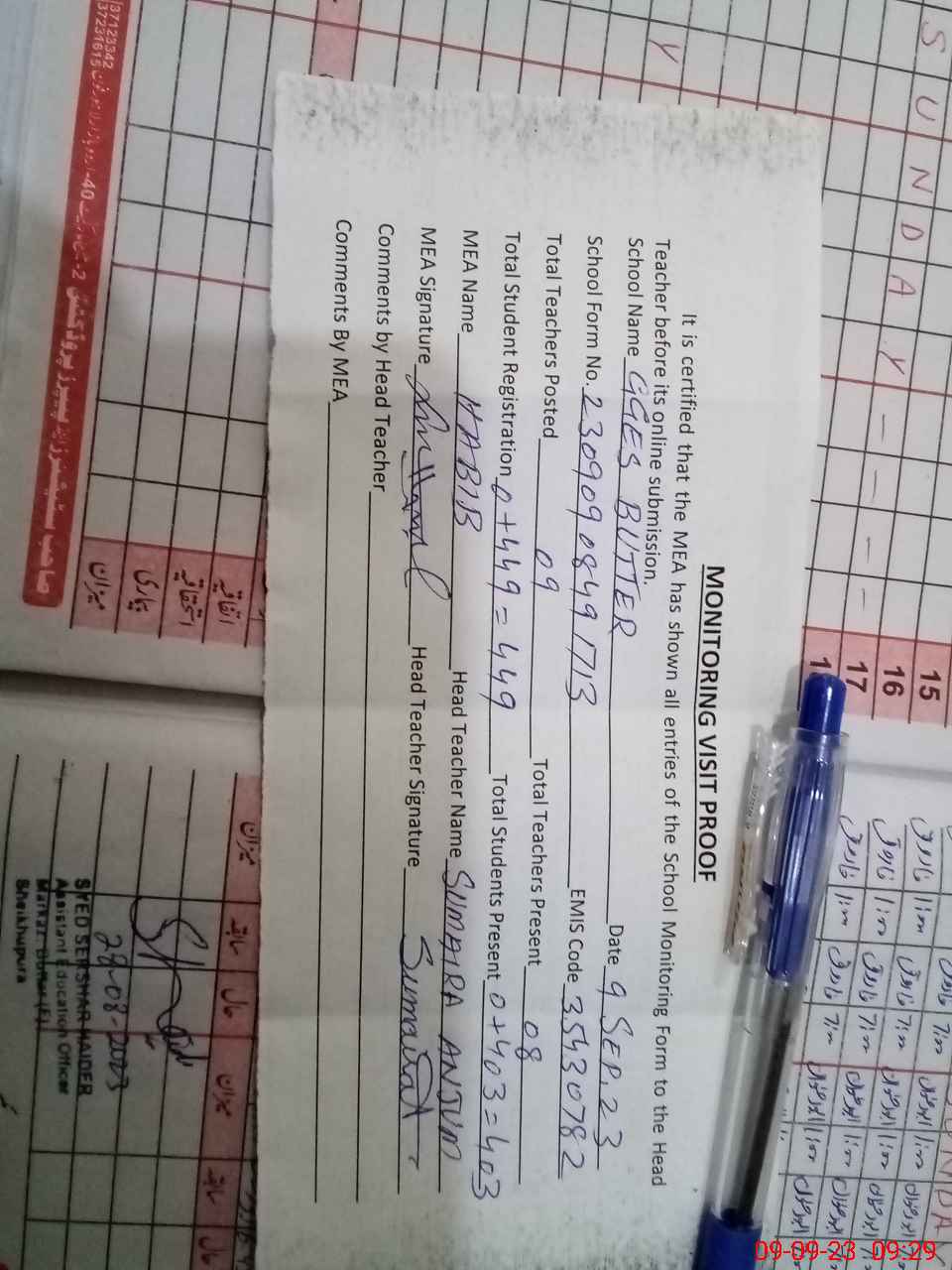 | Attendance Register | Head Teacher | MEA with School | Visit Proof |
