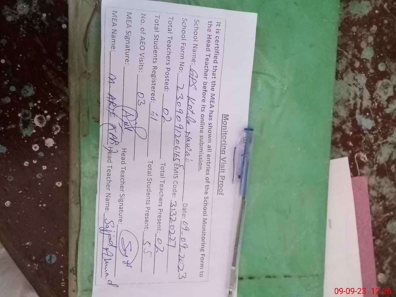 | Attendance Register | Head Teacher | MEA with School | Visit Proof |