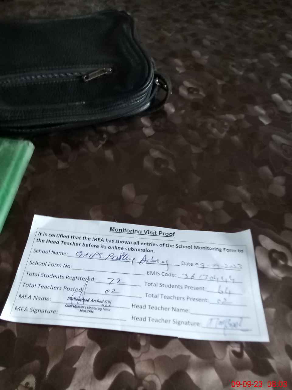 | Attendance Register | Head Teacher | MEA with School | Visit Proof |