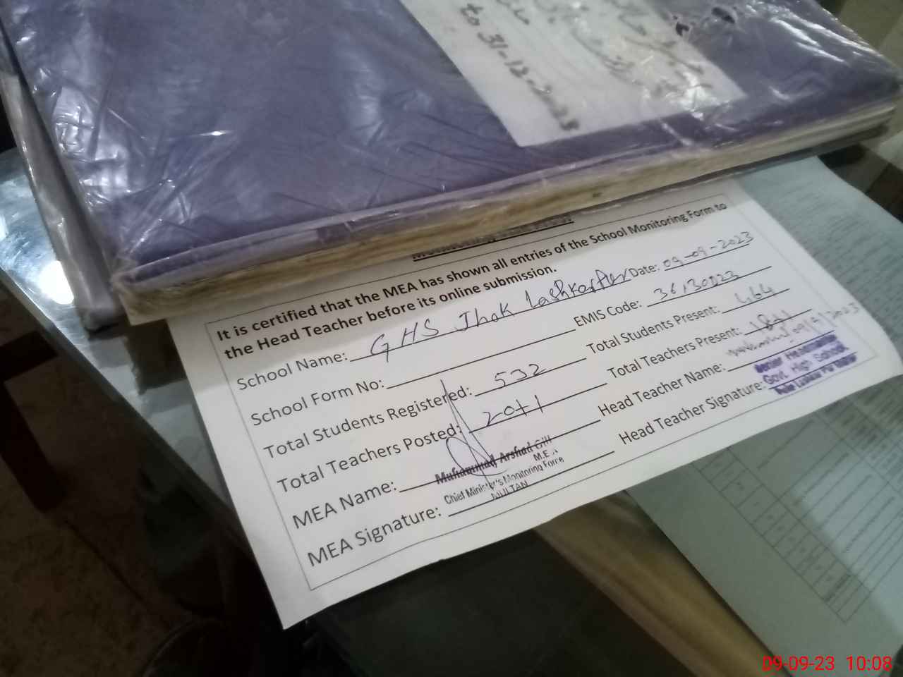 | Certified that this School was Inspected by the Undersigned MEA/DMO Today and the Information Stated Above is as Per Record. | |||||