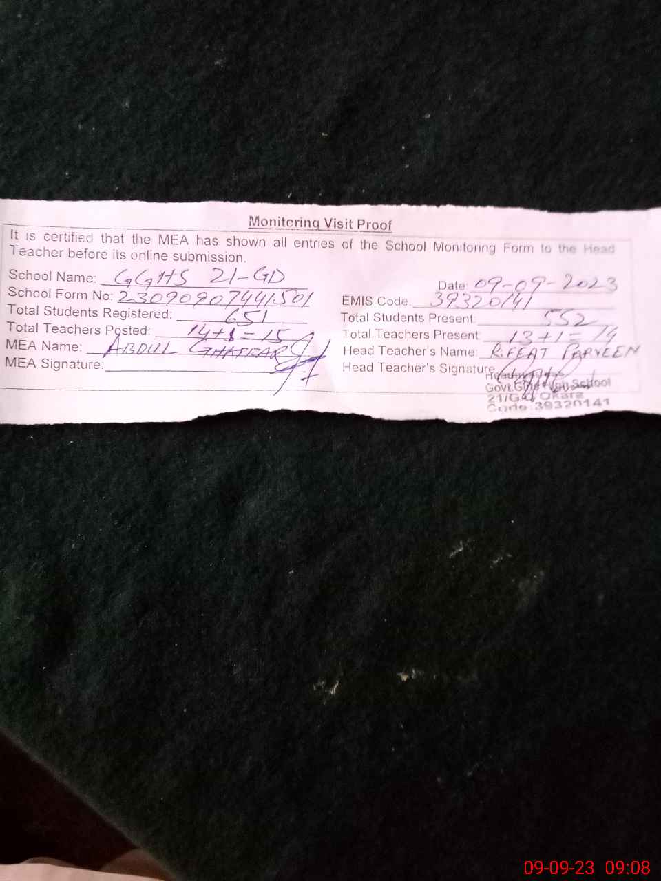 | Attendance Register | Head Teacher | MEA with School | Visit Proof |