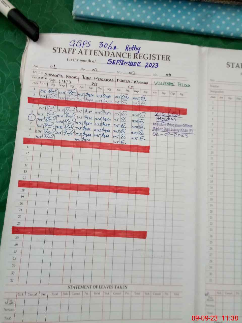 | Remarks (Use Separate Page if Required): 01 Teacher newly posted Named Naila Kanwal Total teachers 03 Total present teachers 03 | |||||