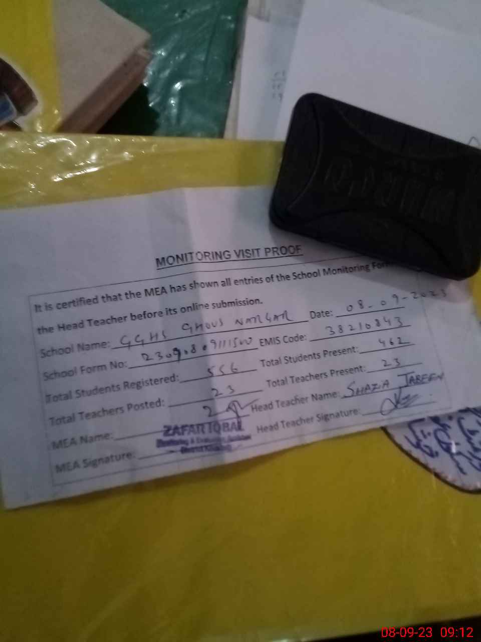 | Attendance Register | Head Teacher | MEA with School | Visit Proof |