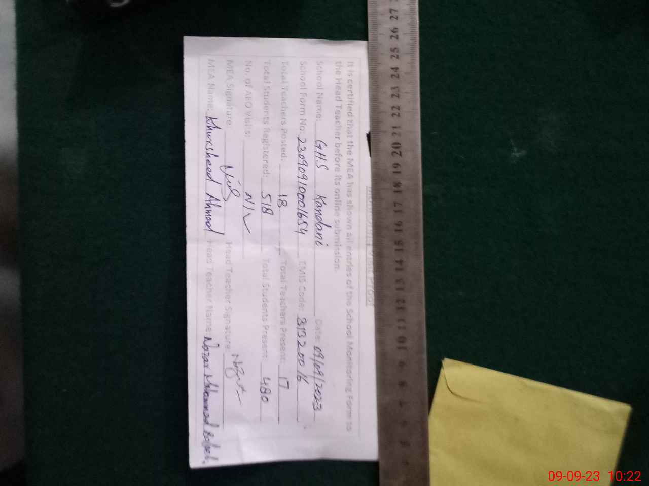 | Monitoring Date: 09-09-2023 | Start Time: 09-09-2023 10:00 AM | End Time: 09-09-2023 10:22 AM | Name of MEA: Kh**** Ah**** | |