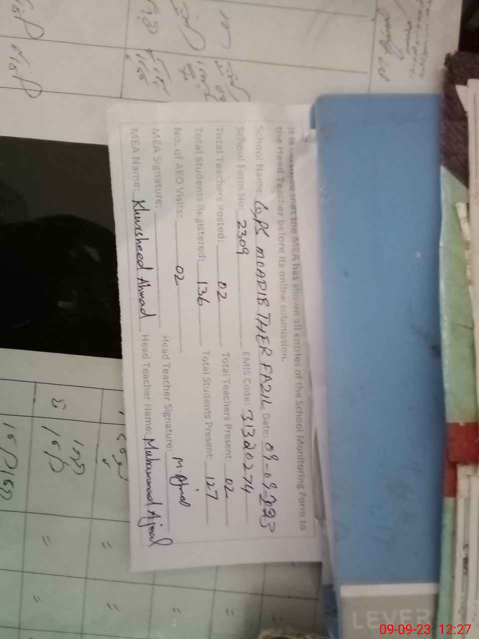 | Attendance Register | Head Teacher | MEA with School | Visit Proof |