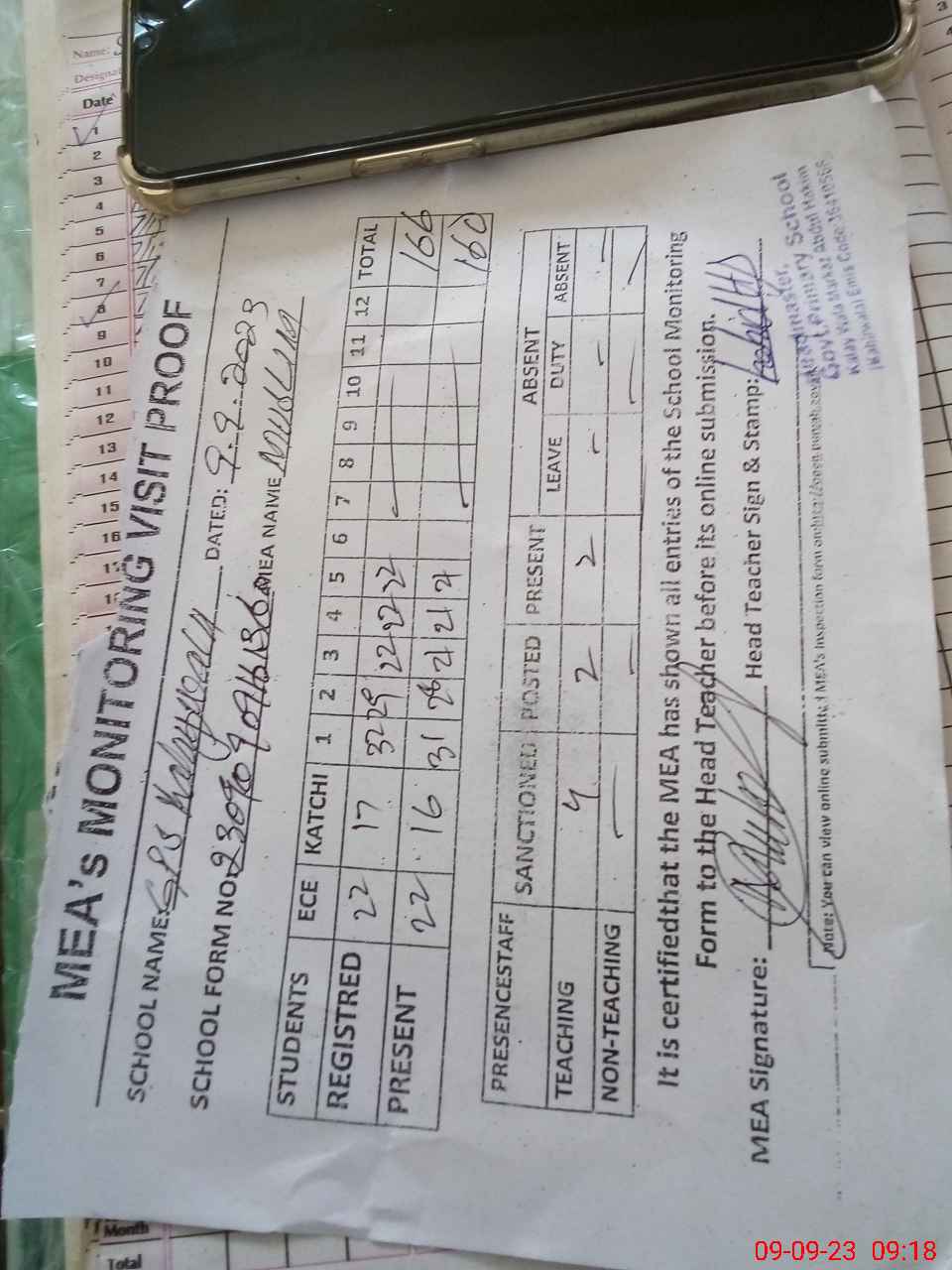 | Attendance Register | Head Teacher | MEA with School | Visit Proof |