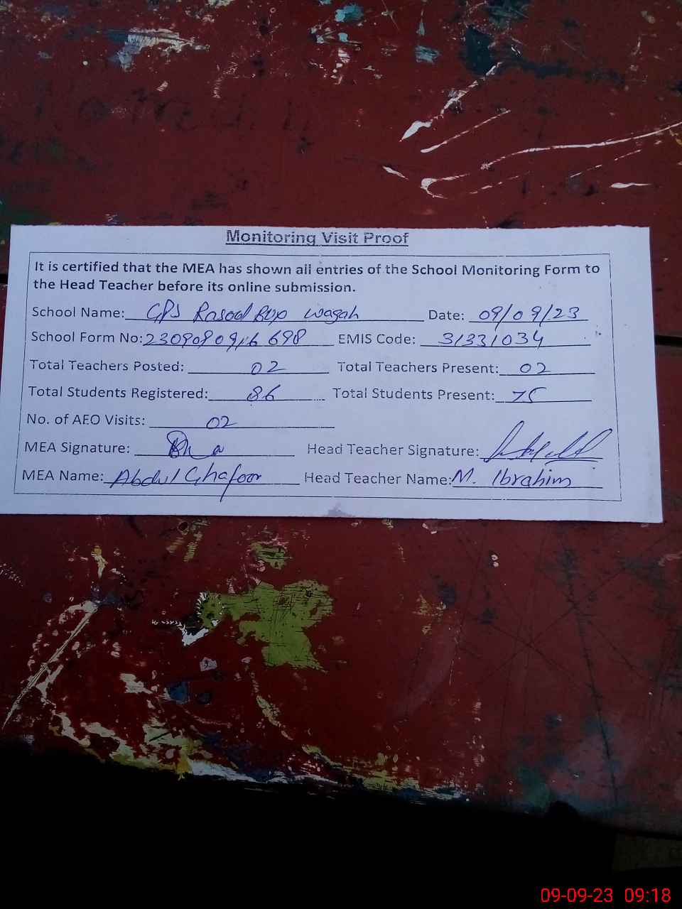 | Attendance Register | Head Teacher | MEA with School | Visit Proof |