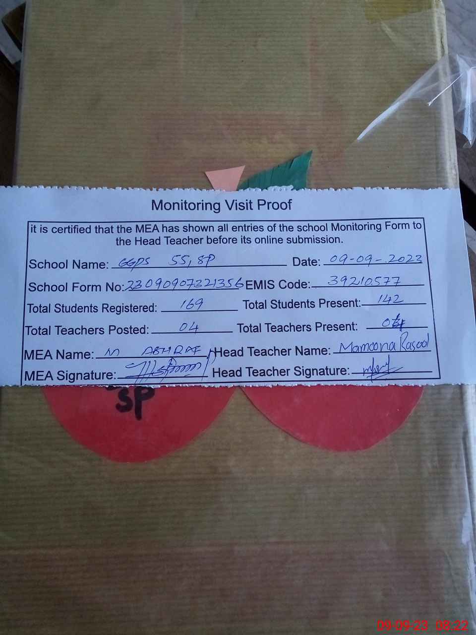 | Attendance Register | Head Teacher | MEA with School | Visit Proof |