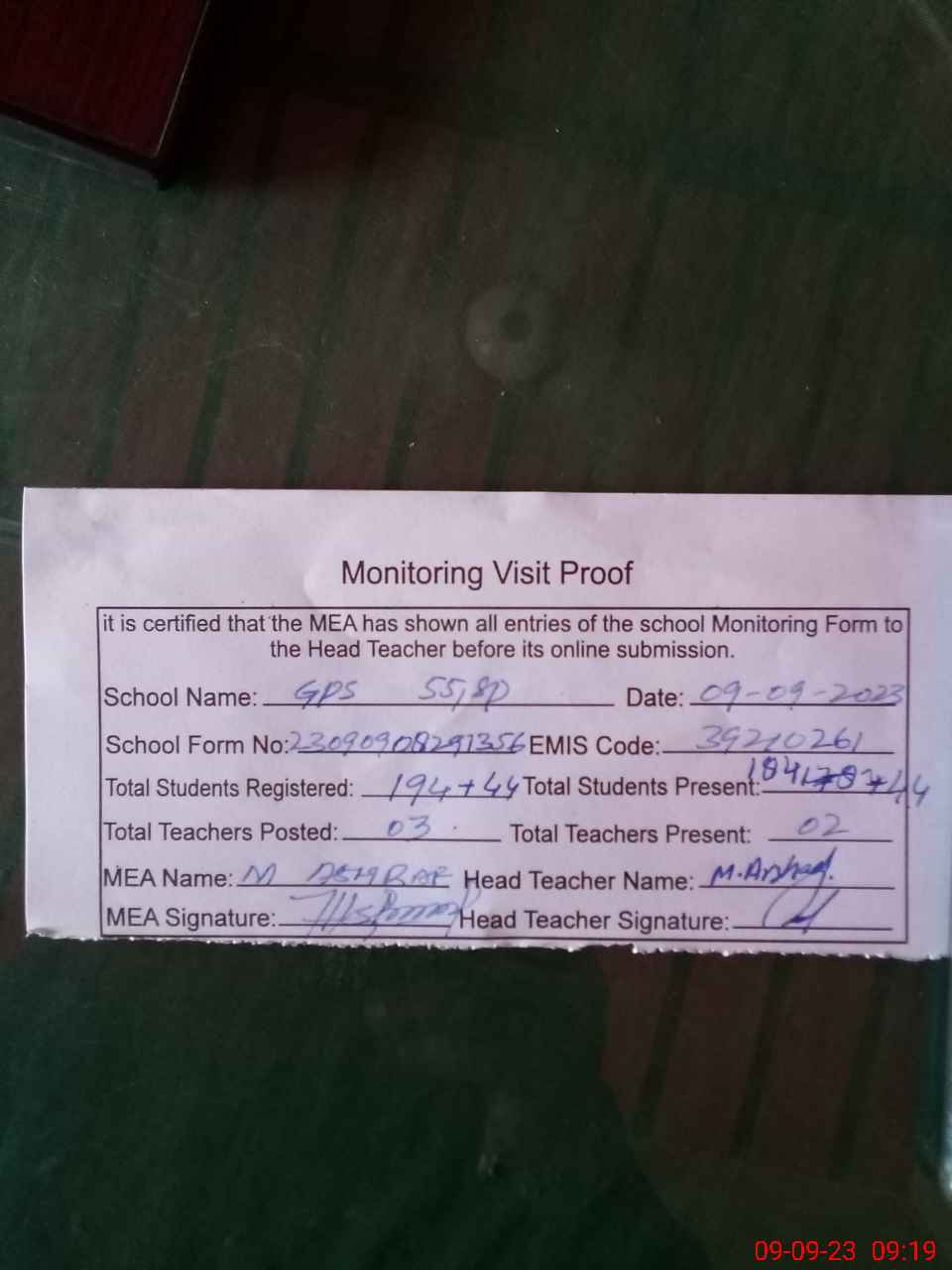 | Attendance Register | Head Teacher | MEA with School | Visit Proof |
