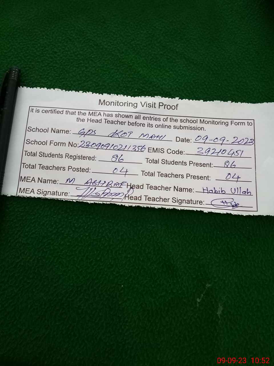 | Monitoring Date: 09-09-2023 | Start Time: 09-09-2023 10:21 AM | End Time: 09-09-2023 10:54 AM | Name of MEA: MU**** AS**** | |