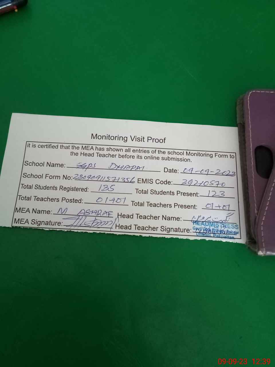 | Attendance Register | Head Teacher | MEA with School | Visit Proof |