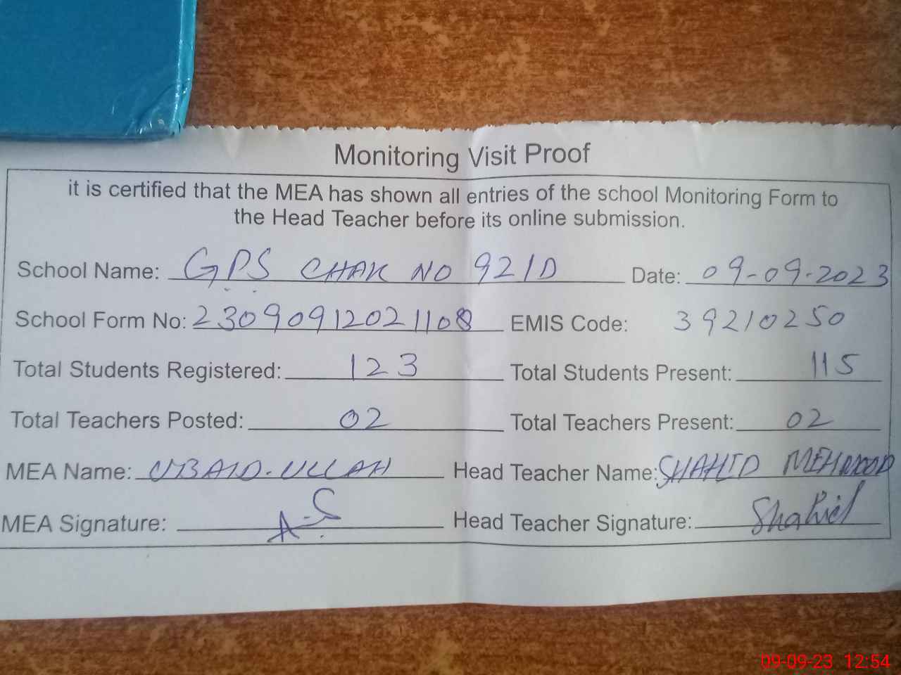 | Attendance Register | Head Teacher | MEA with School | Visit Proof |