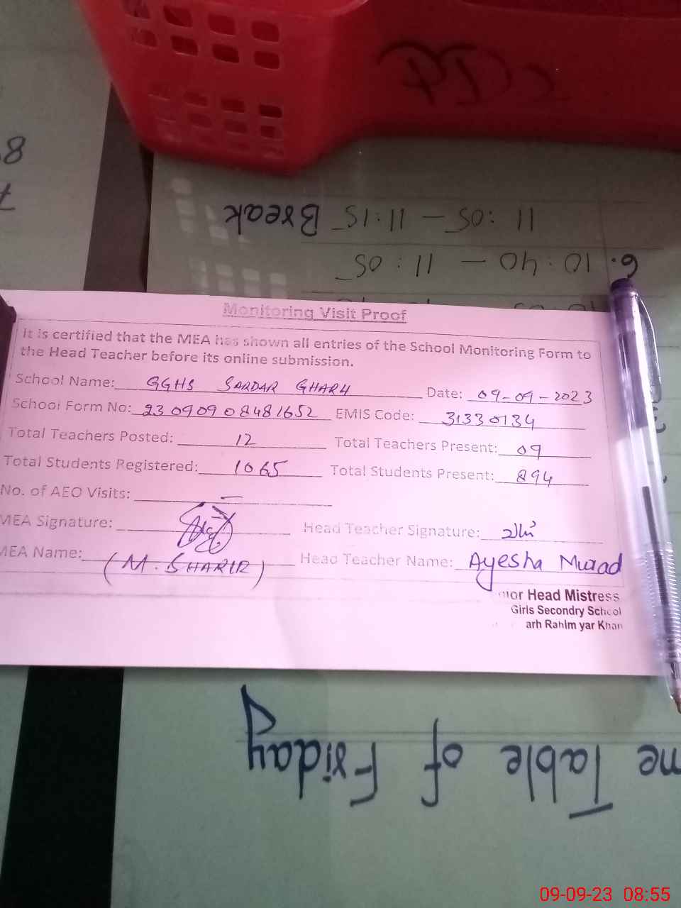 | Attendance Register | Head Teacher | MEA with School | Visit Proof |