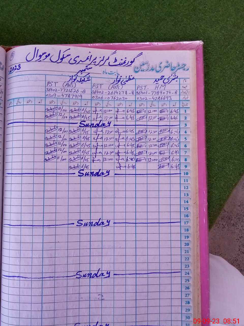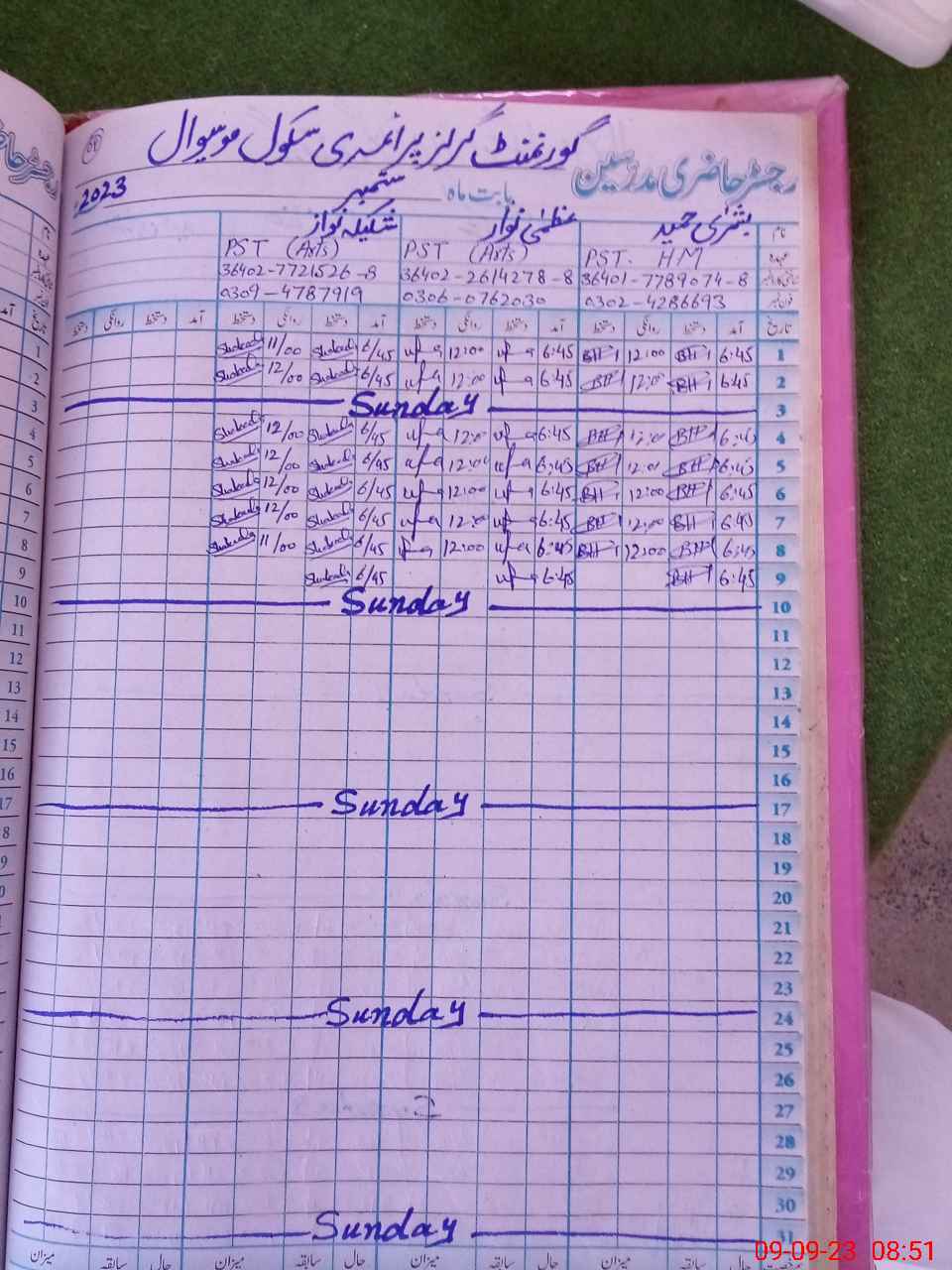 | Name: Uz**** Na**** Designation: (School Headmaster's/Headmistress's) PST Phone/Cell Number: 03**** |