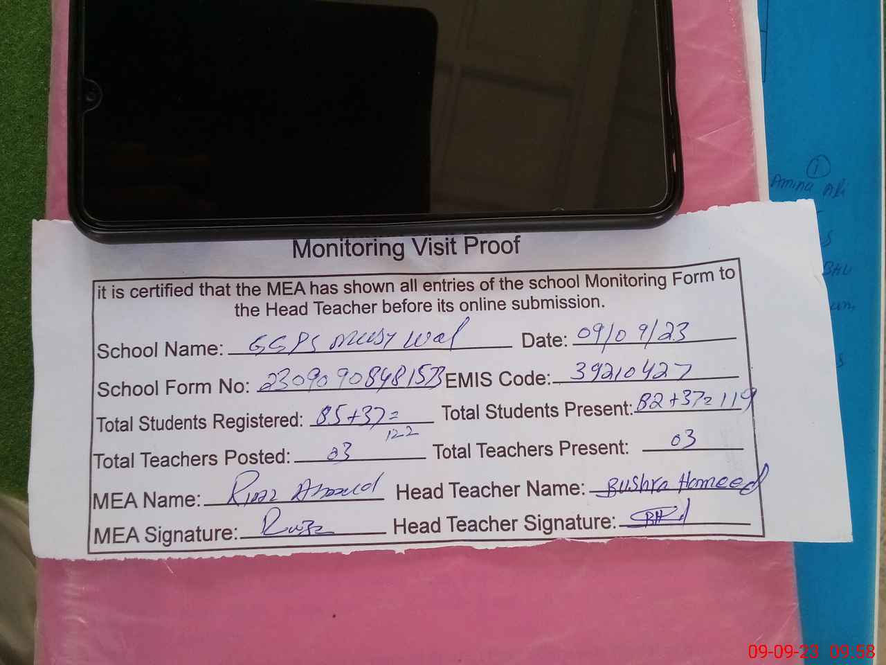| Attendance Register | Head Teacher | MEA with School | Visit Proof |