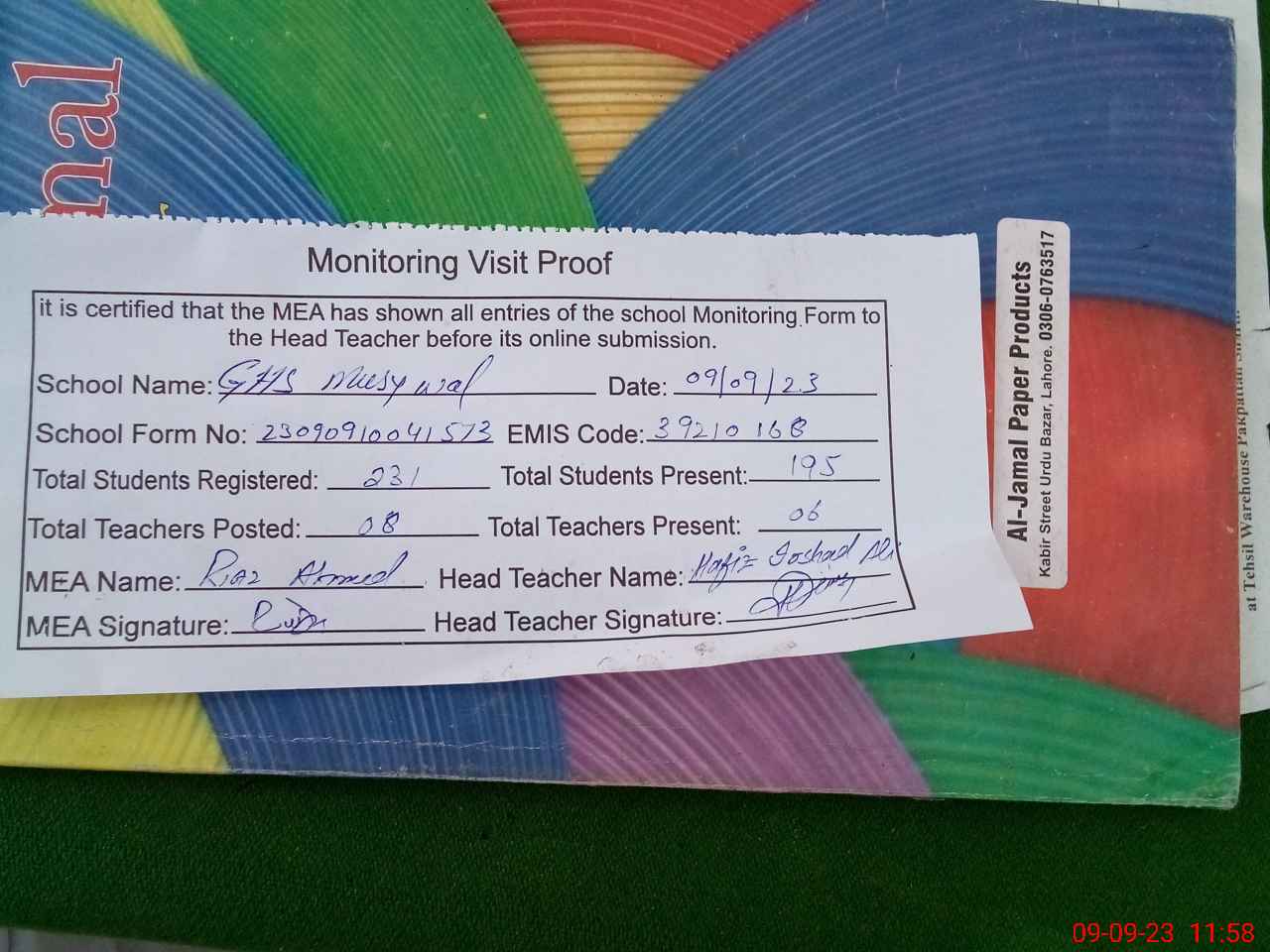 | Attendance Register | Head Teacher | MEA with School | Visit Proof |