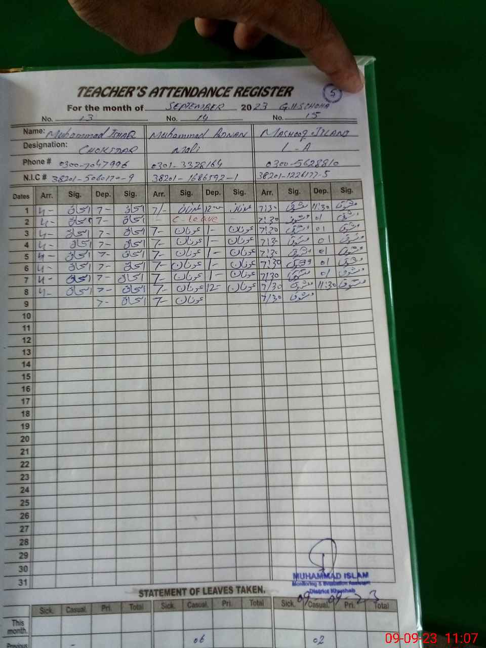 | Name: M.AS**** UL**** Designation: (School Headmaster's/Headmistress's) SST SC Phone/Cell Number: 03**** |