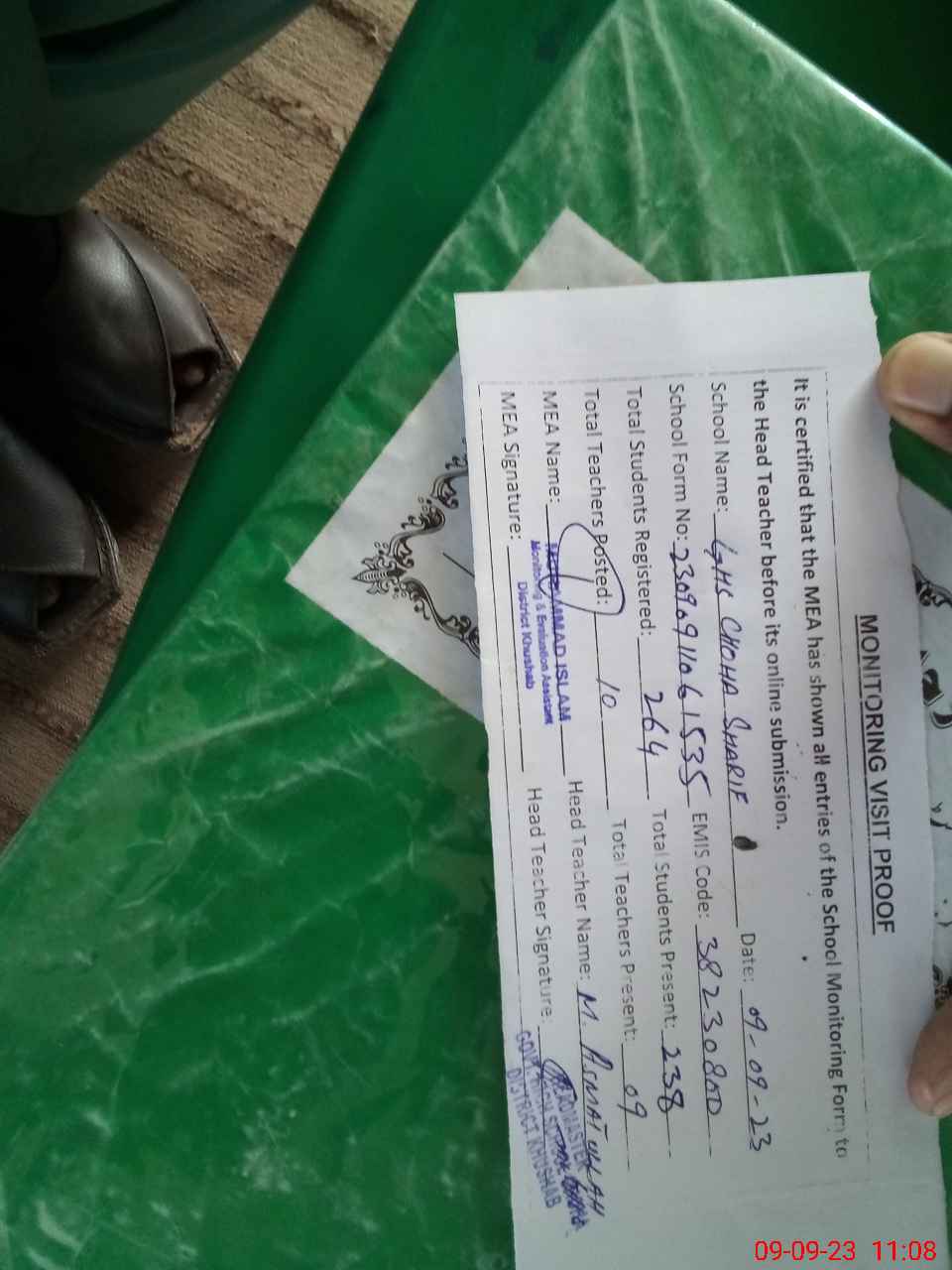 | Attendance Register | Head Teacher | MEA with School | Visit Proof |