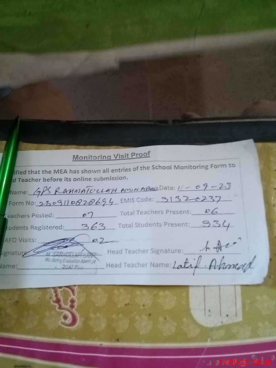 | Monitoring Date: 11-09-2023 | Start Time: 11-09-2023 08:15 AM | End Time: 11-09-2023 08:40 AM | Name of MEA: Mu**** Sa**** Ul**** Sa**** | |