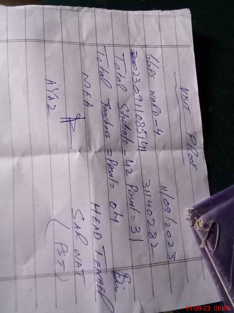 | Attendance Register | Head Teacher | MEA with School | Visit Proof |