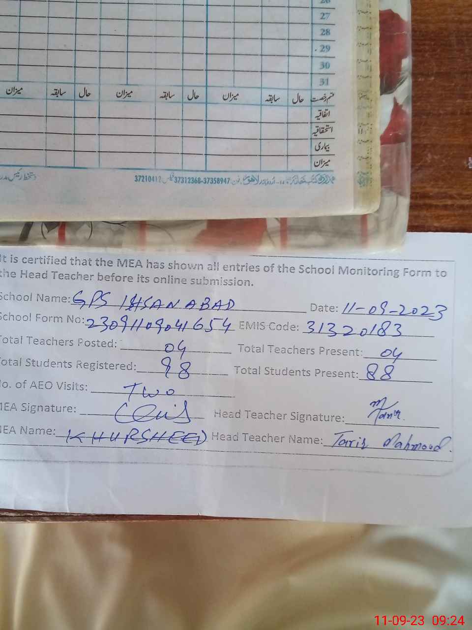 | EMIS Code: 31320183 | Name of School: GPS IHSAN ABAD | |||