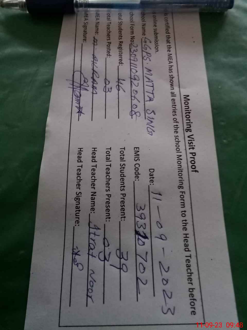 | Attendance Register | Head Teacher | MEA with School | Visit Proof |