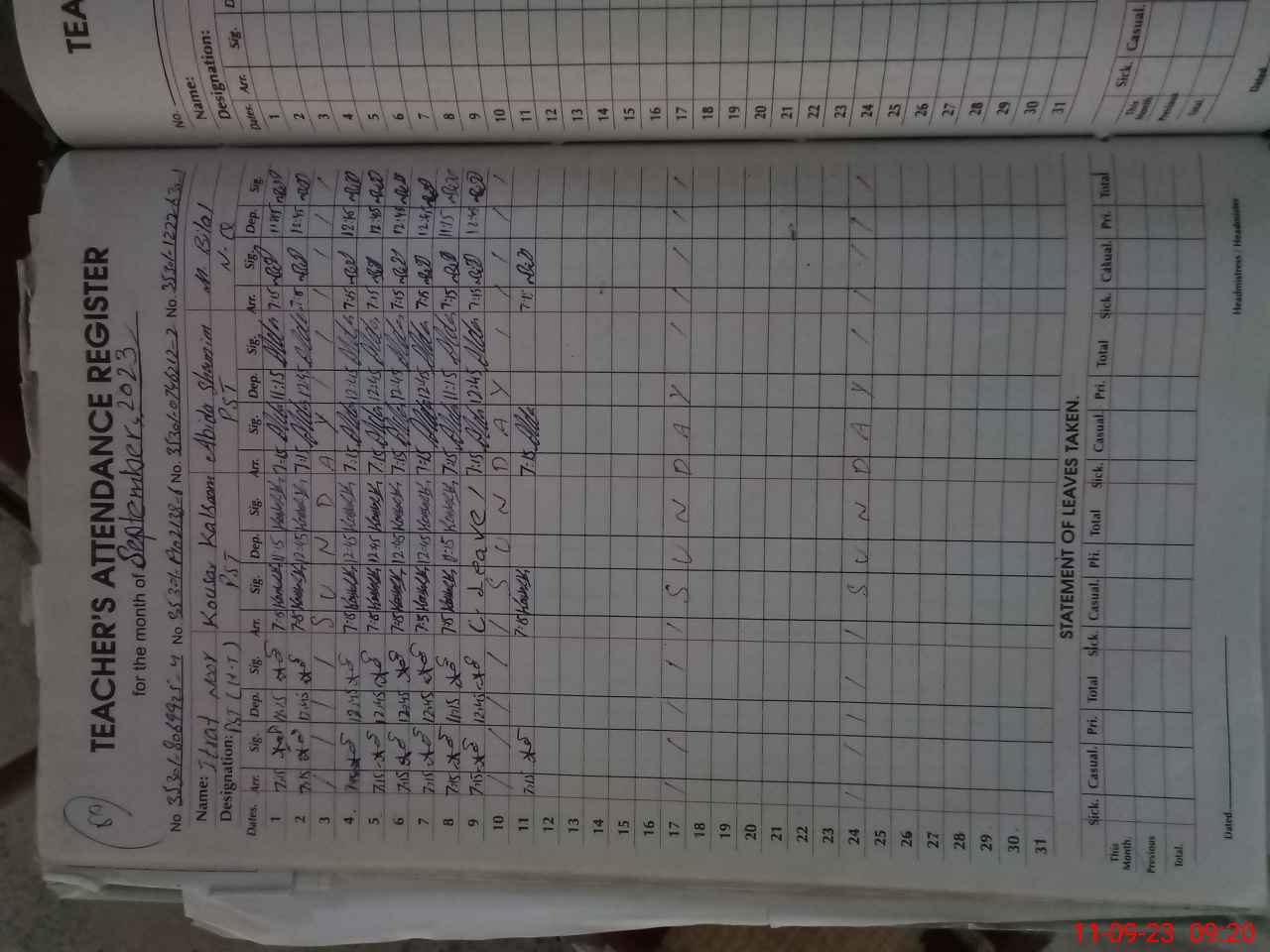 | Monitoring Date: 11-09-2023 | Start Time: 11-09-2023 09:20 AM | End Time: 11-09-2023 09:48 AM | Name of MEA: MU**** AK**** (R**** | |