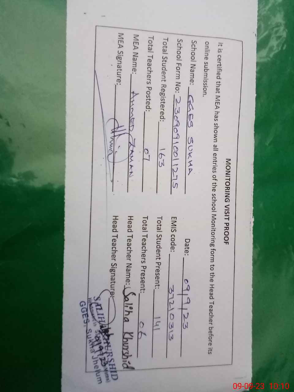 | Monitoring Date: 09-09-2023 | Start Time: 09-09-2023 09:36 AM | End Time: 09-09-2023 10:18 AM | Name of MEA: Ah**** Za**** | |