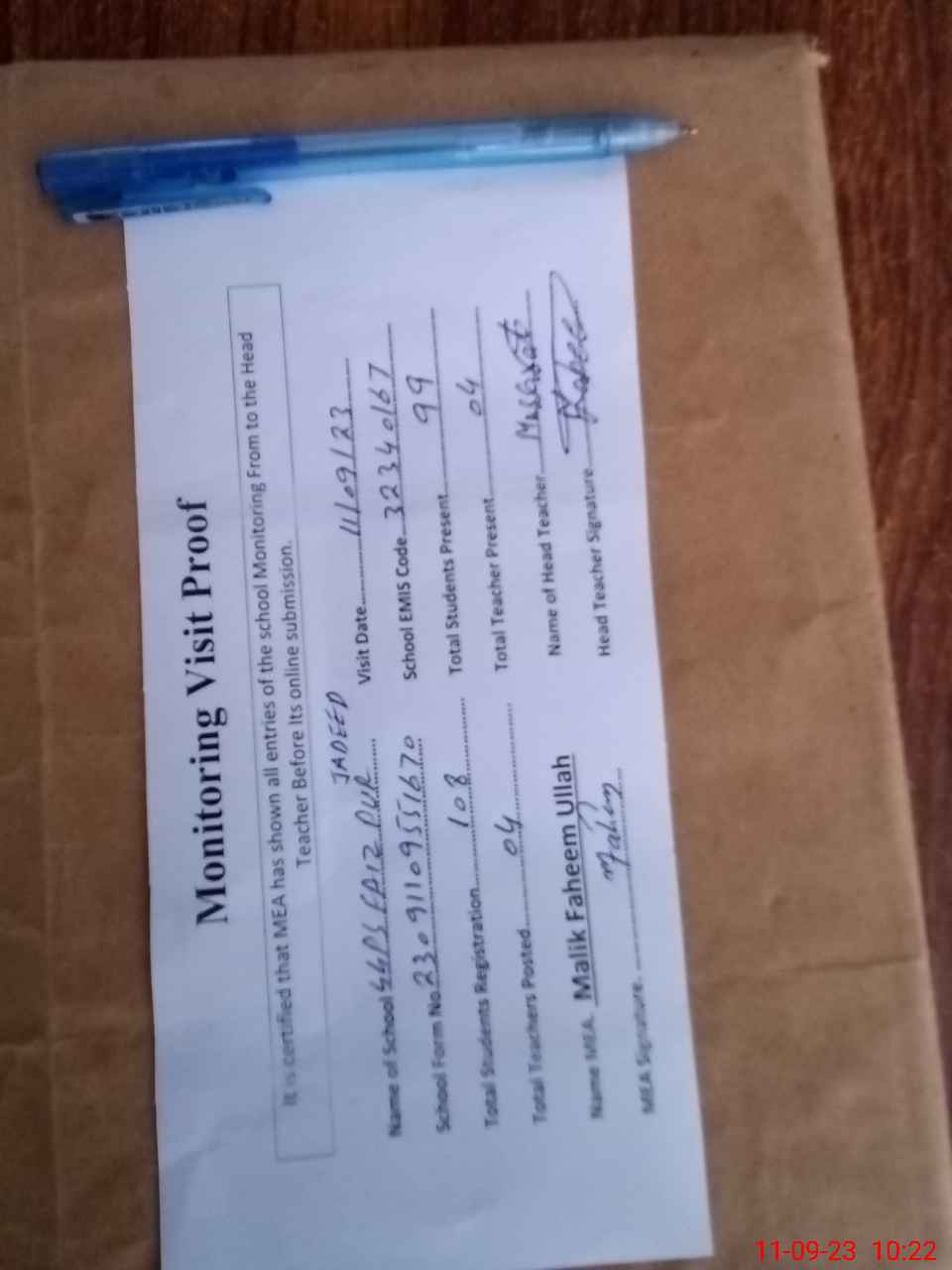 | Attendance Register | Head Teacher | MEA with School | Visit Proof |