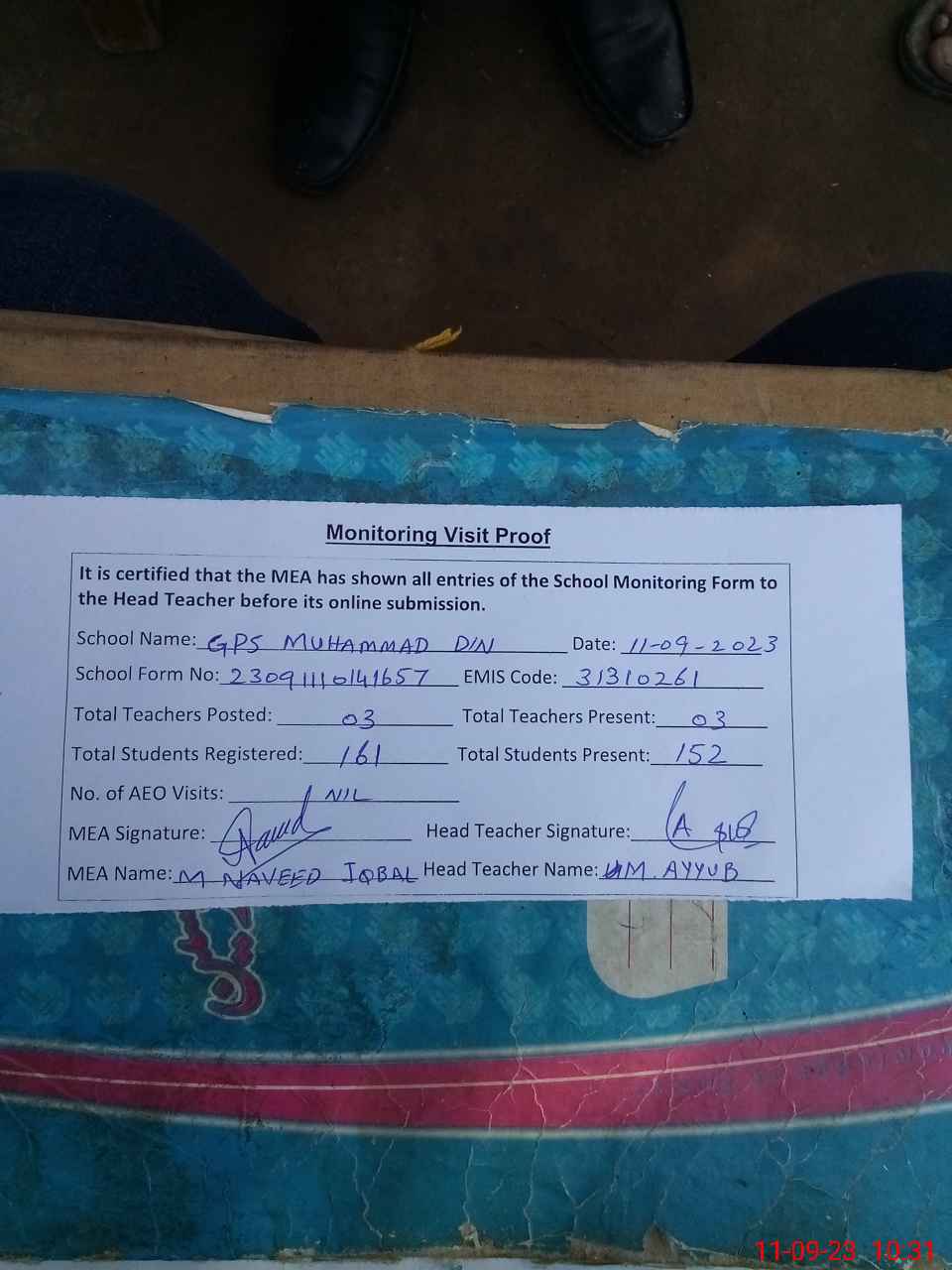 | EMIS Code: 31310261 | Name of School: GPS MUHAMMAD DIN | |||