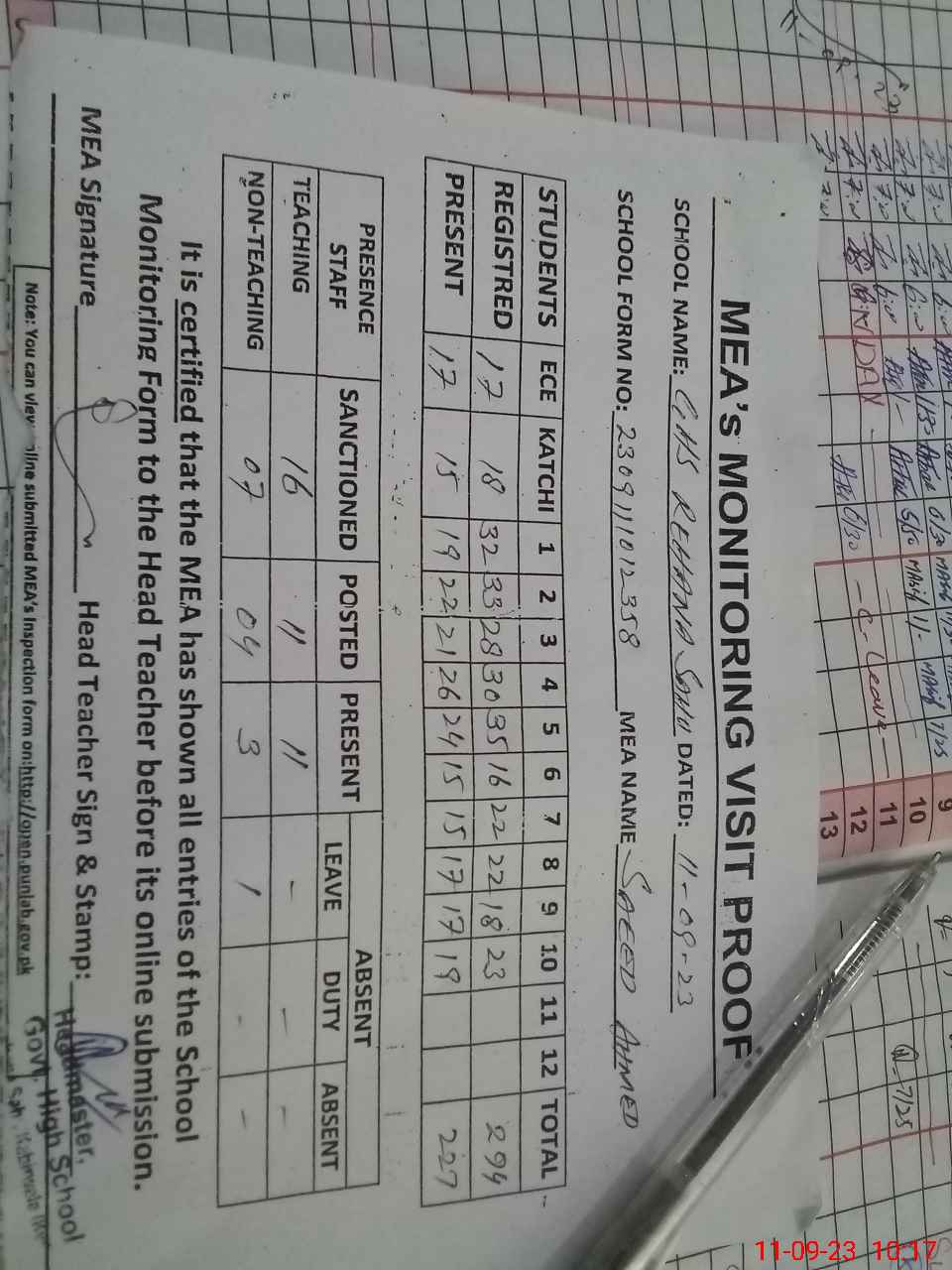 | Attendance Register | Head Teacher | MEA with School | Visit Proof |