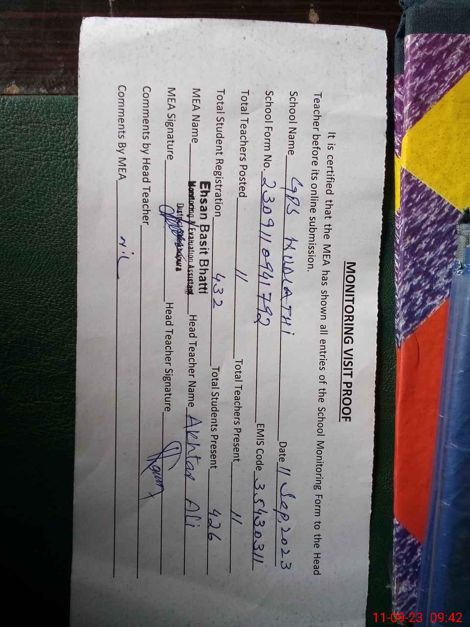 | Attendance Register | Head Teacher | MEA with School | Visit Proof |