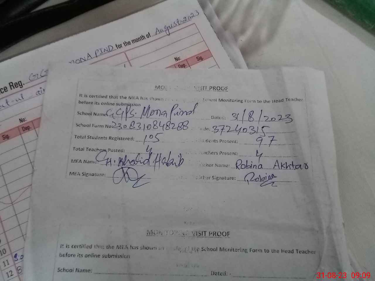 | Monitoring Date: 31-08-2023 | Start Time: 31-08-2023 08:47 AM | End Time: 31-08-2023 09:52 AM | Name of MEA: Kh**** ha**** | |