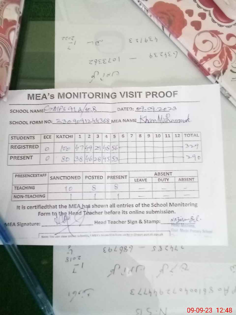 | Attendance Register | Head Teacher | MEA with School | Visit Proof |