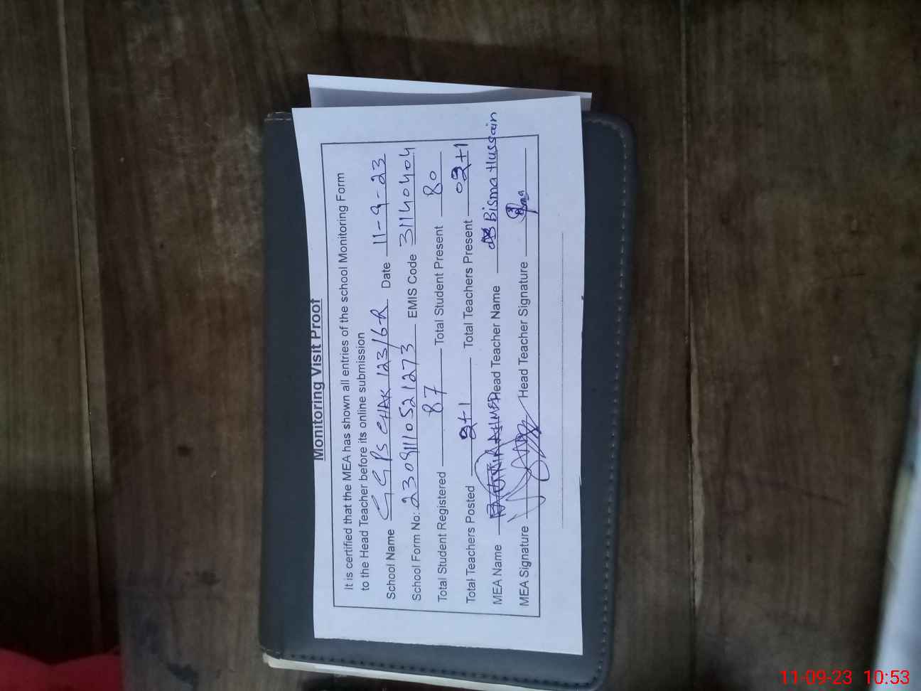 | Attendance Register | Head Teacher | MEA with School | Visit Proof |