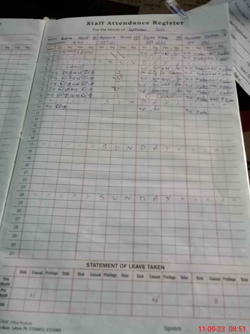 | 31**** | MU**** MU**** AH**** | S G | 0 | 0 | 31 | 0 | 0 | 0 | 0 | 0 | 0 | Absent (Un-Authorized) | |