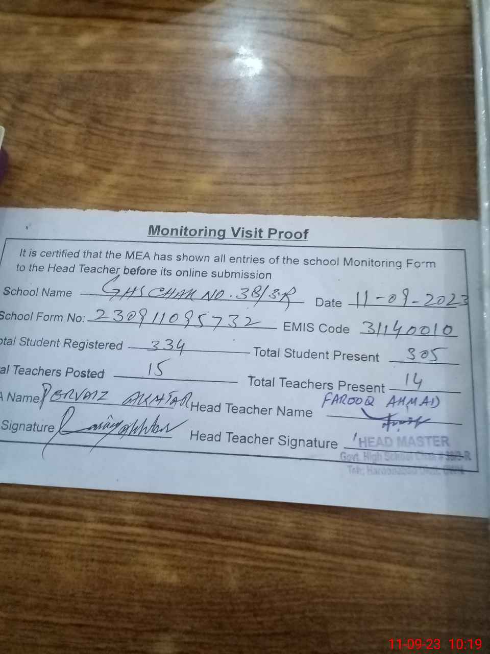 | Attendance Register | Head Teacher | MEA with School | Visit Proof |