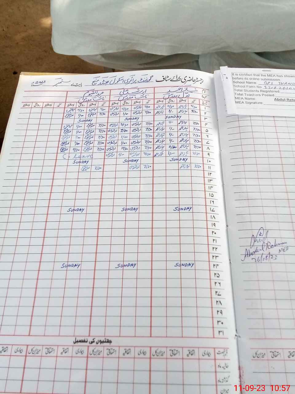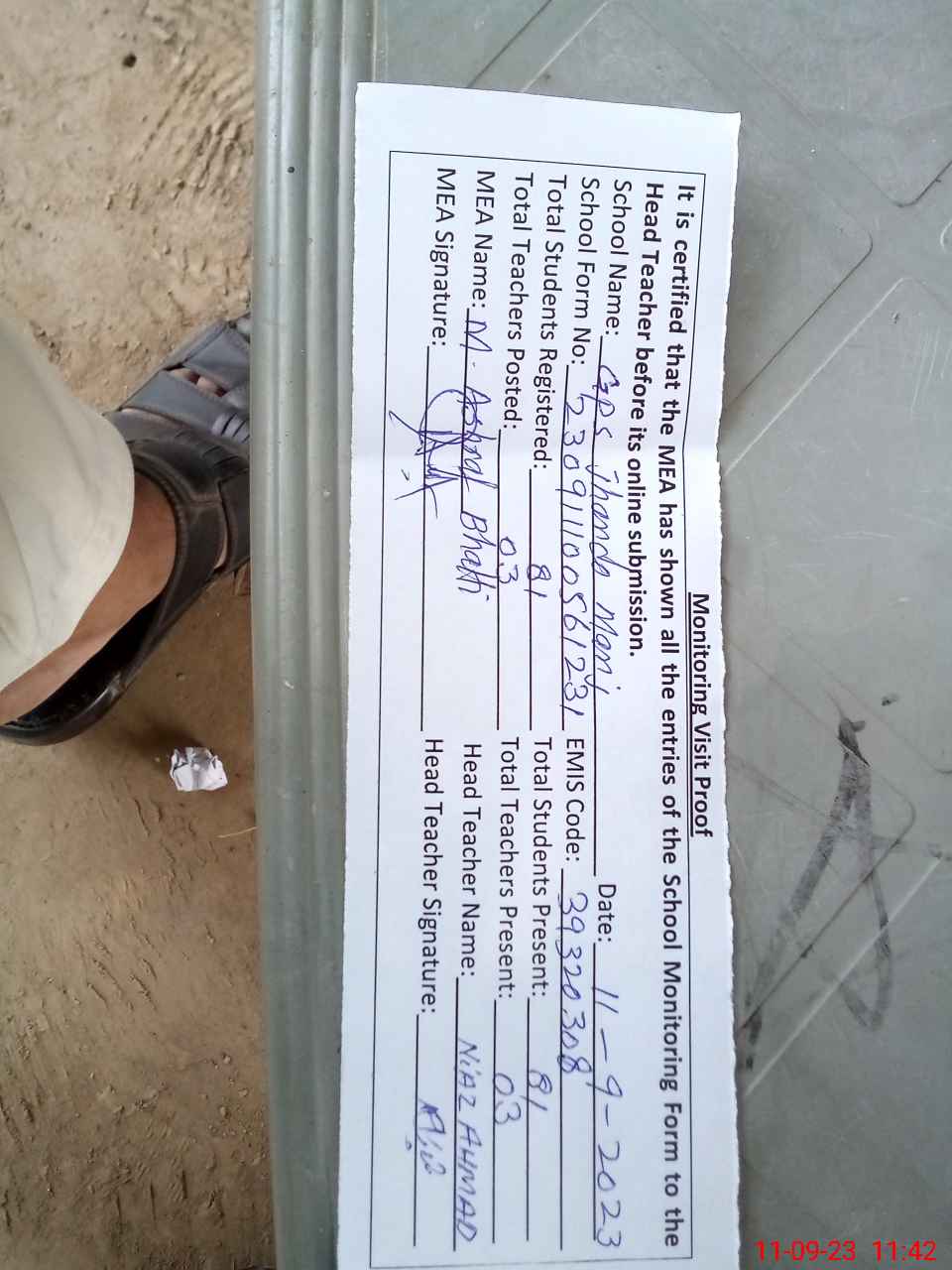 | Attendance Register | Head Teacher | MEA with School | Visit Proof |